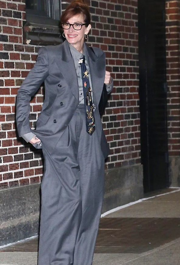 Հոլիվուդյան աստղը հյուր էր Նյու Յորքում կայացած «The Late Show with Stephen Colbert» հաղորդմանը: Ջուլիա Ռոբերտսին նկատել են Մանհեթենի միդթաունում գտնվող ստուդիայի դրսում: Նա հագել էր բաց մոխրագույն մետաքսե վերնաշապիկ և մի քանի երանգով ավելի մուգ կոստյում: Լայն ծալքերով նորաձև բլեյզերը համադրվել էր ազատ, բարձր իրանով տաբատի հետ: