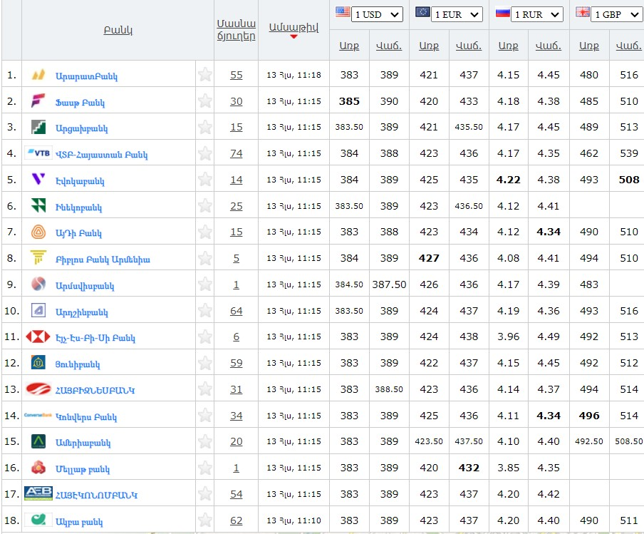 -ը ներկայացնում է դրամի փոխարժեքը ՀՀ բանկերում հուլիսի 13-ի դրությամբ՝ ըստ rate.am-ի։