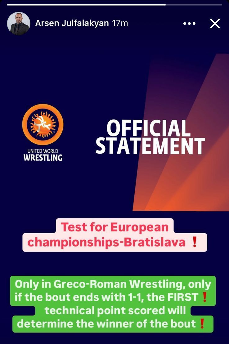 Սլովակիայի մայրաքաղաք Բրատիսլավայում կայանալիք հունահռոմեական ոճի ըմբշամարտի Եվրոպայի առաջնության ժամանակ նոր կանոն կկիրառվի, սոցցանցերում հայտնել է Ըմբշամարտի համաշխարհային ֆեդերացիայի (UWW) մարզիկների հանձնաժողովի նախագահ Արսեն Ջուլֆալակյանը: